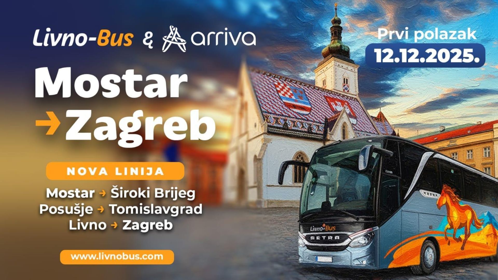 U suradnji s partnerom Livno Bus od 12. prosinca uvodimo novu međunarodnu autobusnu liniju Zagreb – Mostar - Zagreb, koja svakodnevno povezuje Hrvatsku i Hercegovinu.